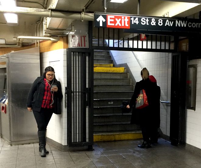 subway riders finishing up a call before heading into the subway or even fishing for service while underground.