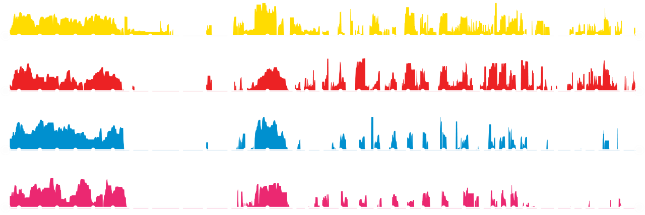 While data just by itself can seem mysterious, adding contextual information helps to understand it. Besides adding stations and boroughs to each of the lines we also indicated the WiFi enabled stations as well as underground and overground segments by hand. Below, the contextualized data of the 1 train.